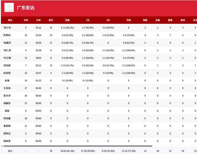从个人数据来看,广东队4人得分上双,徐小华15分4篮板3助攻6失误,吾赞依尔10分7篮板5助攻,姚嘉泽17人9篮板,梁琼斌15分,谈仁凯9投3中,拿到9分2篮板3助攻6失误。